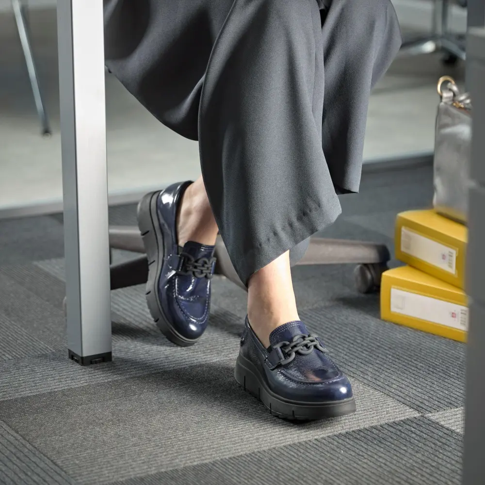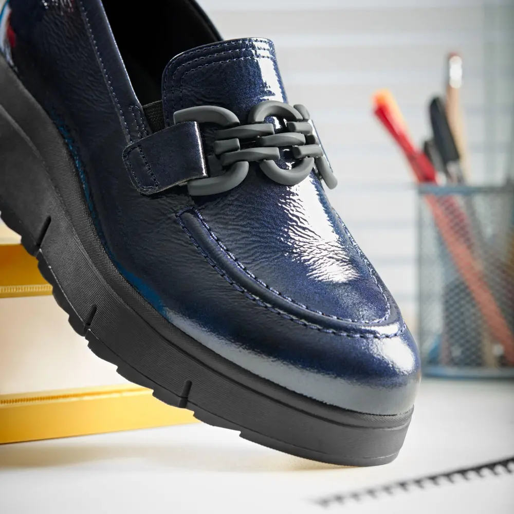 • Obermaterial aus hochwertigem, marineblauem Lackleder